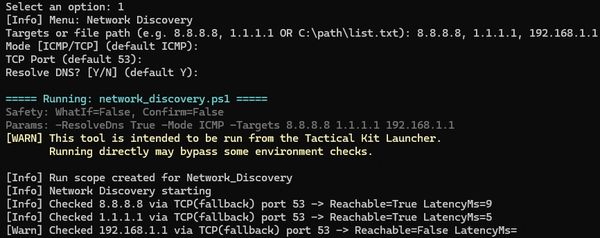 From the Tactical Kit Launcher, select Network Discovery and enter targets such as 8.8.8.8, 1.1.1.1 192.168.1.1. The module performs reachability testing, latency measurement, DNS resolution, and connection validation using structured, validated network methods. The process is traceable, logged, and executed within the CLTK validated environment.
